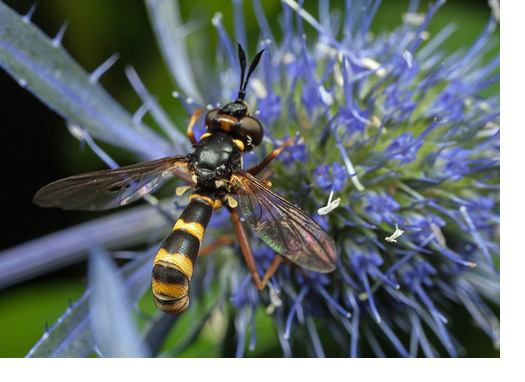 Although the adult flies enjoy nectar, the larvae are parasitioids (they parasitise and eventually kill their hosts); of various bees and wasps. The females of Conops quadrifasciatus specialise in attacking bumblebees in flight. They wait on flowers for a bumblebee to arrive and then hijack the bee and whilst holding on; inject an egg into the bee's abdomen. The egg hatches inside the bee and the larva feeds on the bee's abdominal contents. The bumblebee eventually dies and the larva then pupates and emerges the following summer.